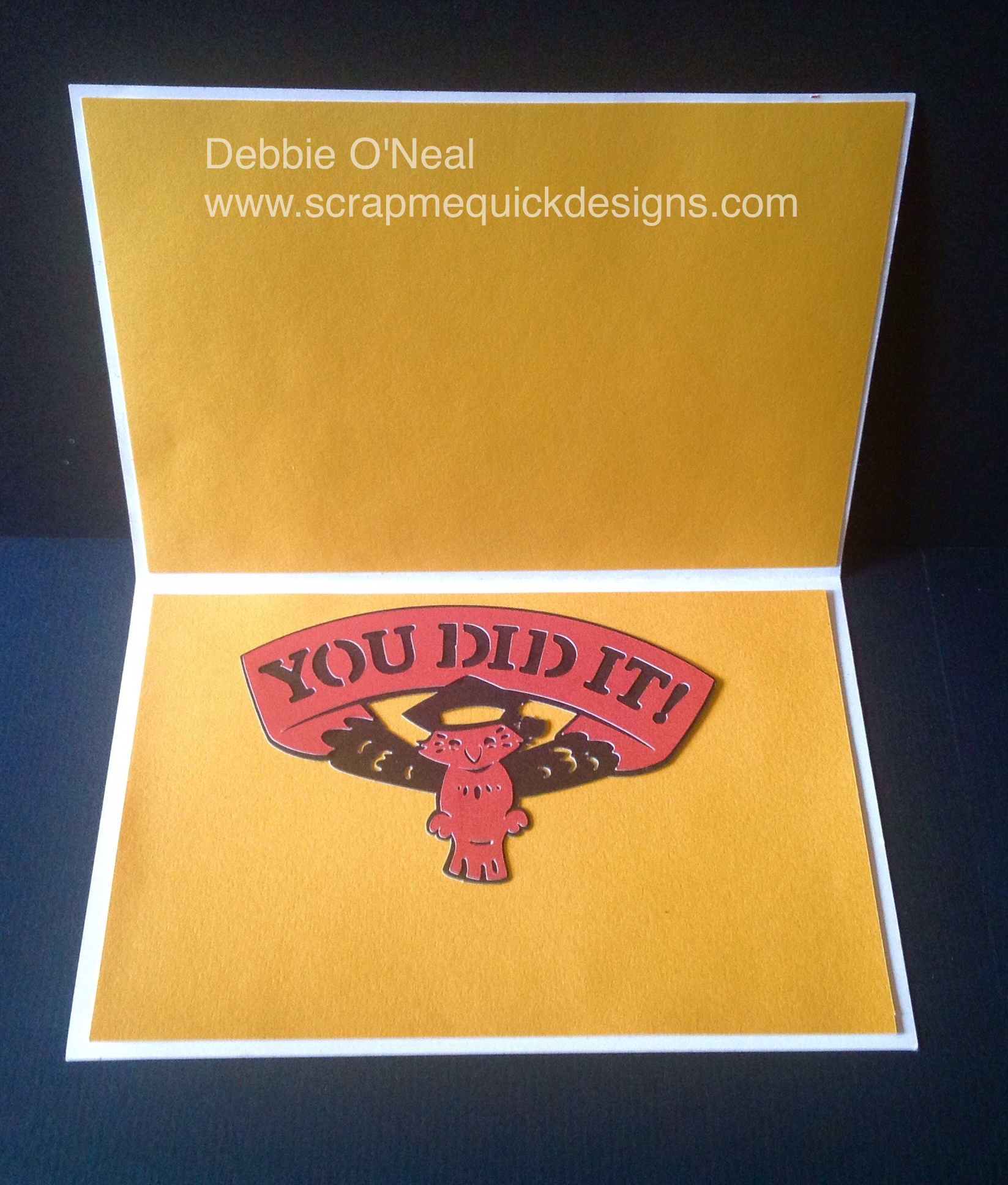And of course, the inside of the card deserved some attention too. This fun “YOU DID IT !” image from the Happy Graduation Cartridge (click link to see) really added that extra touch I wanted for the inside. I created a liner to use for sentiment out of the same yellow cardstock to match the backing piece for the front of the card. Note: I sized this card to fit inside a 5X7 Sized envelop of your choice.