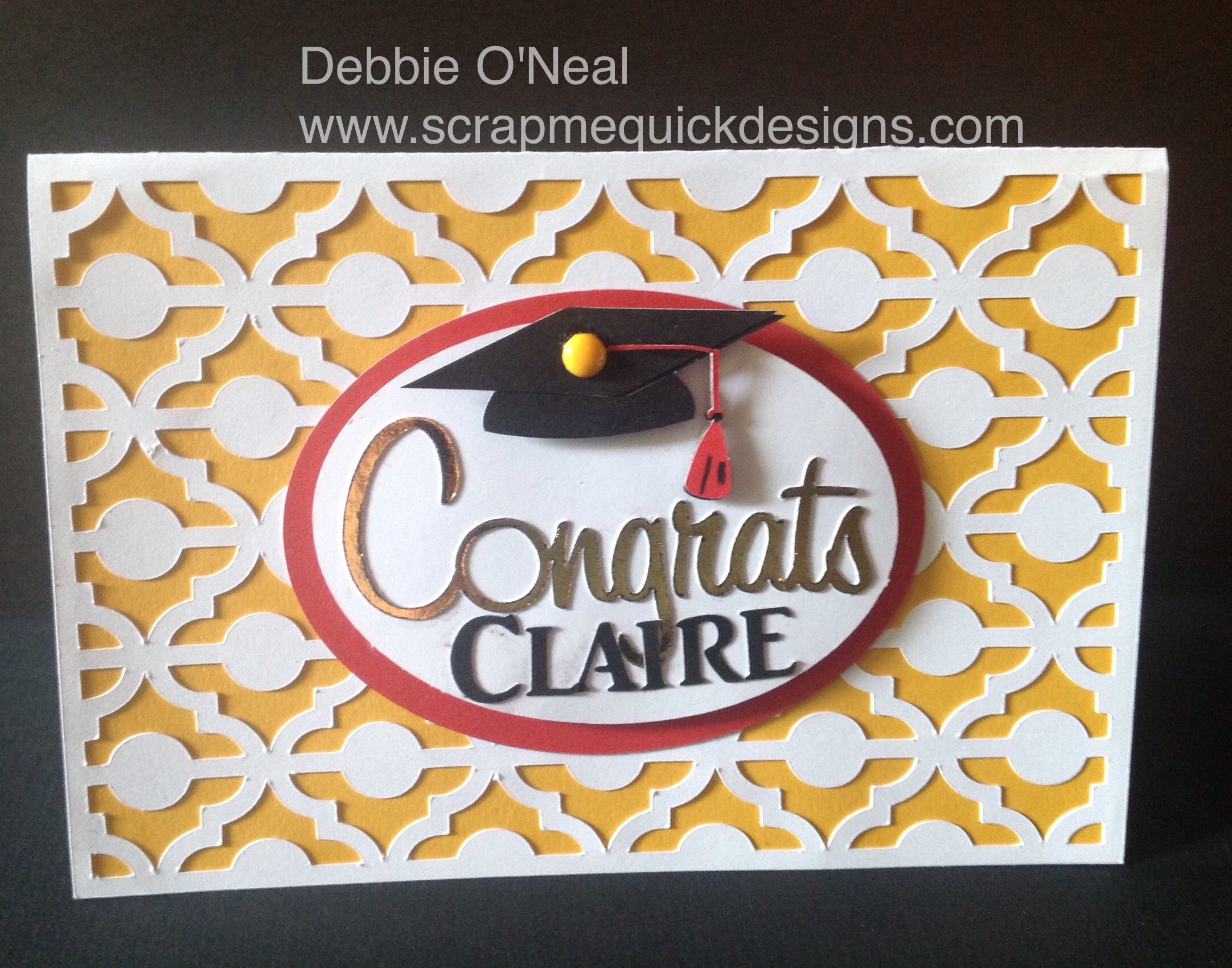 This Custom Congrats Card uses a beautiful cut out background as the base that is from the Decorate! Celebrate ! Cartridge (click link to see). If you have not checked out that cartridge you should do so.It’s exclusive to Design Space Subscribers through May and then available for purchase. Lots of great images on it. I selected CTMH cardstock in the colors of graduate’s school for fun. The Congrats cut out I did using a foil technique with toner paper and a laminate machine but you could use regular cardstock or metallic cardstock to add that touch to your card. I used a homemade enamel dot to the graduation cap but you could use a store bought one or brad top.