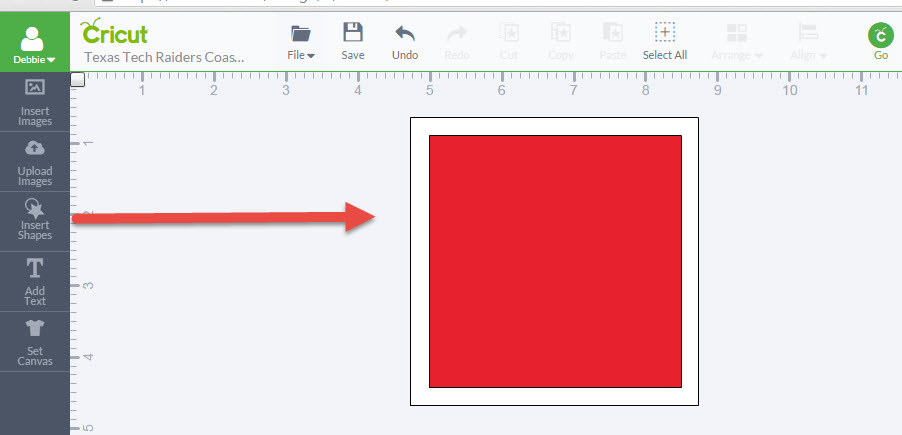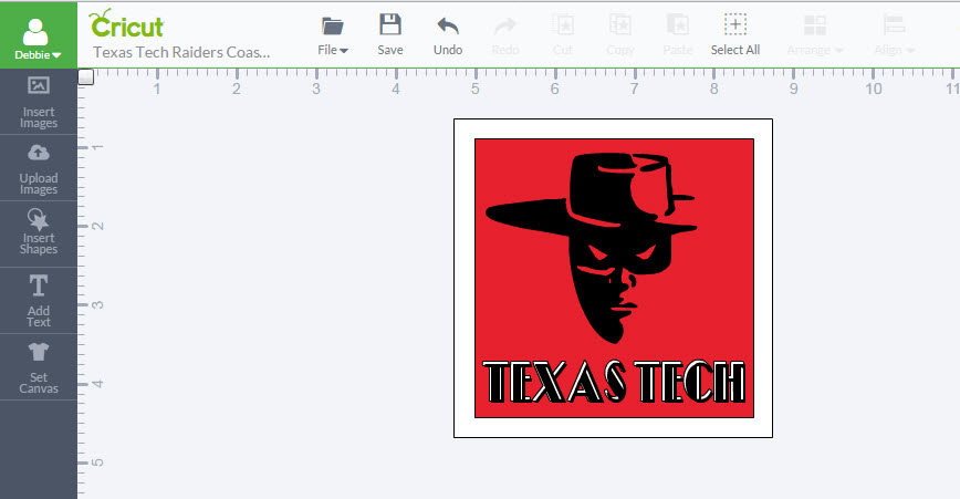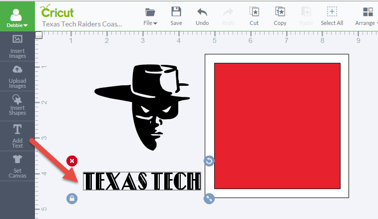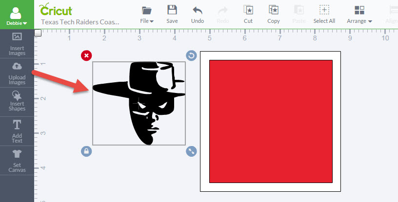 6. Now size the images to fit within your coaster shape. You will need to use the Arrange feature on the top menu to get these added shapes to layer on the coaster shape in the order you want. Note: For my coaster design, the red square, raider image and the text will be cut out of vinyl to be placed on the white ceramic coaster. I just unselect the white square when I send the project to cut.