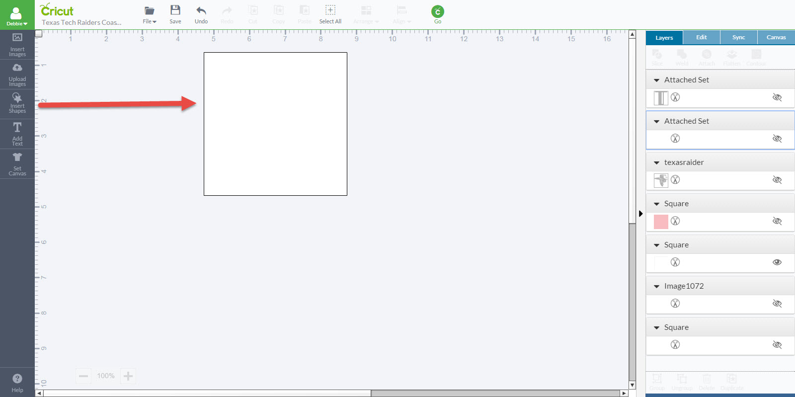 6. Now size the images to fit within your coaster shape. You will need to use the Arrange feature on the top menu to get these added shapes to layer on the coaster shape in the order you want. Note: For my coaster design, the red square, raider image and the text will be cut out of vinyl to be placed on the white ceramic coaster. I just unselect the white square when I send the project to cut.