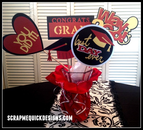 A party would not be complete without table decorations..but how about some that do double duty ? CUSTOM PHOTO PROPS on sticks are perfect to add some punch to your party tables AND then you can use them for your guest to take photos with your graduate ! These are easy to make by cutting whatever shapes you want out of cardstock and then gluing them to small dowels. Everyone loves to use these to take photos and they are add a LOT of WOW value to your decor.