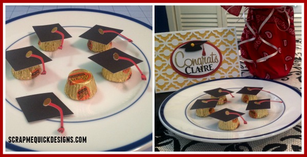 Now we have a banner and some table decor….so now how about some special Reese’s Graduation Cap Treats ? These were really fun to make….just some miniature Reese’s pieces and some grad caps cut out of cardstock #M458A2 added with a glue dot. They are so cute !