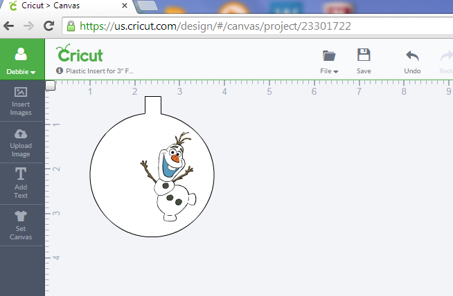 4. Select an image to use that you can add to your clear plastic insert. I used images from the Cricut FROZEN digital cartridge available for the Cricut Explore. I flattened the image in Design Space and sized it to fit on clear plastic insert. Note: I used the insert image as a template to size the image to fit.
