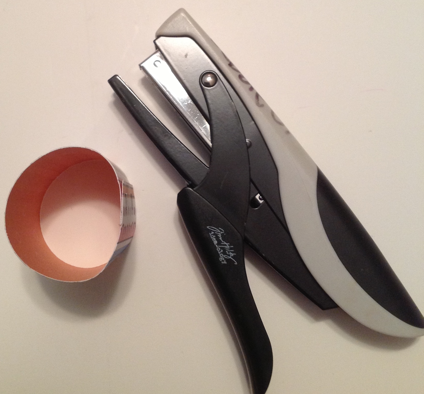 4) Cut 2″ X 6″ strip of cardstock or heavy patterned paper to use as the NAPKIN RING part for each die cut image you made. Roll the strip over until it over laps about 1/4″ and staple a couple of times. Notice this creates a flat side to the circle.