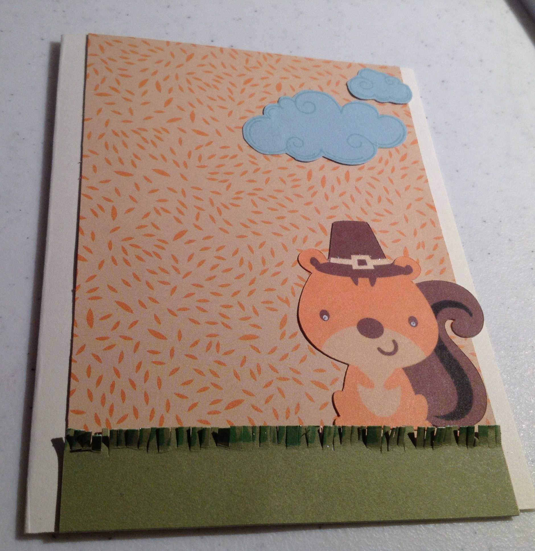 6. Adhere the Squirrel to the background paper so the Squirrel sits on top of the green “grass”