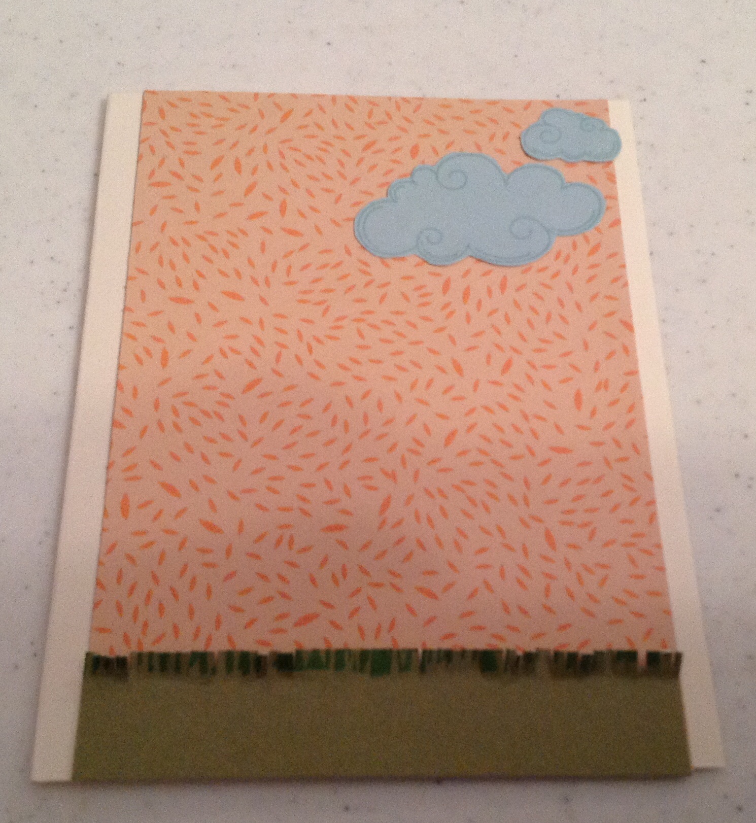 5. Adhere background piece in center of a A2 size card base. Then adhere the stamped clouds to the background. I used CTMH Colonial White Value Pack Cards.