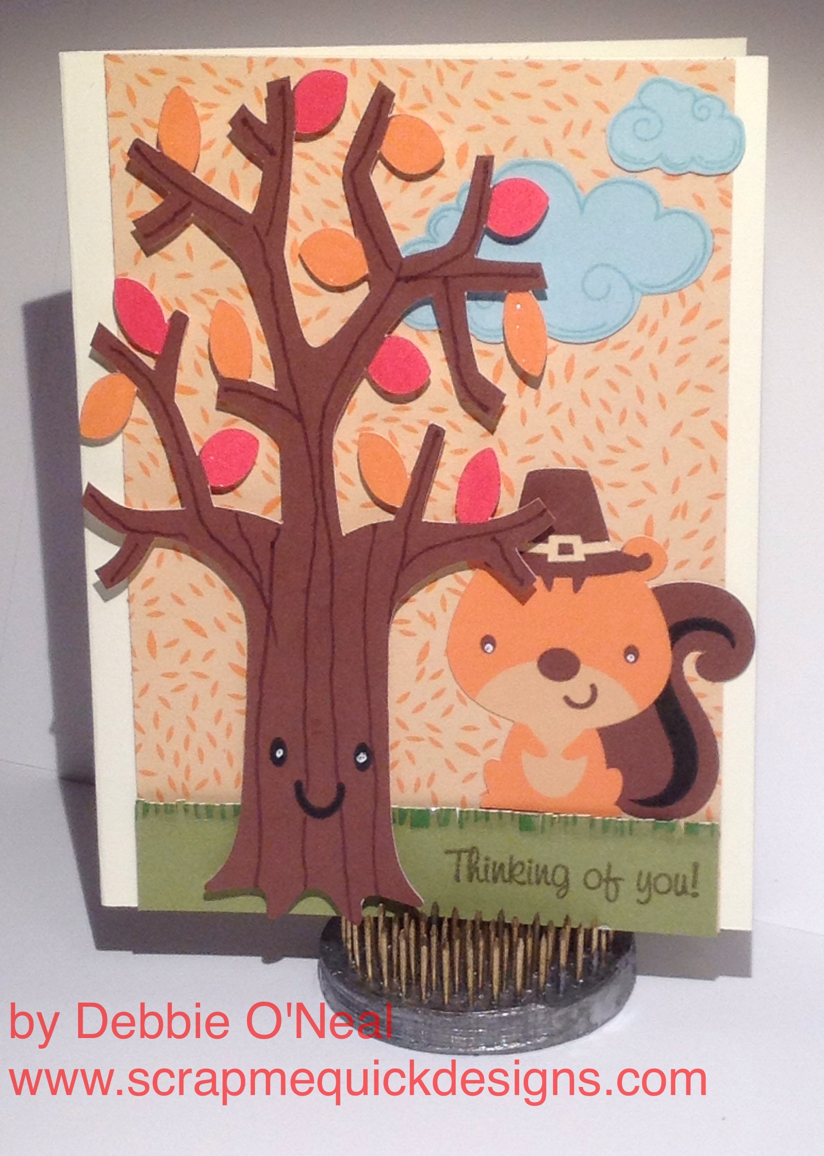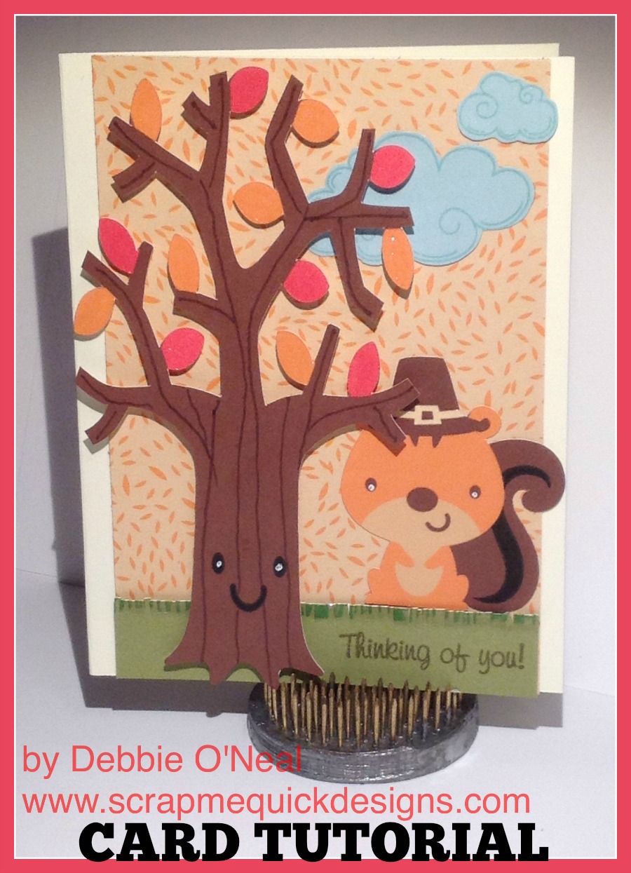 I am having so much fun using the Print Then Cut Feature with Cricut Explore and my Cricut Cartridges. I loved the cute Tree and Pilgrim Squirrel on the Create A Critter 2 cartridge so I made this cute Thanksgiving card. People are always asking me how I make my cards so I am sharing a little tutorial of how this goes together. Hope it helps you create too !