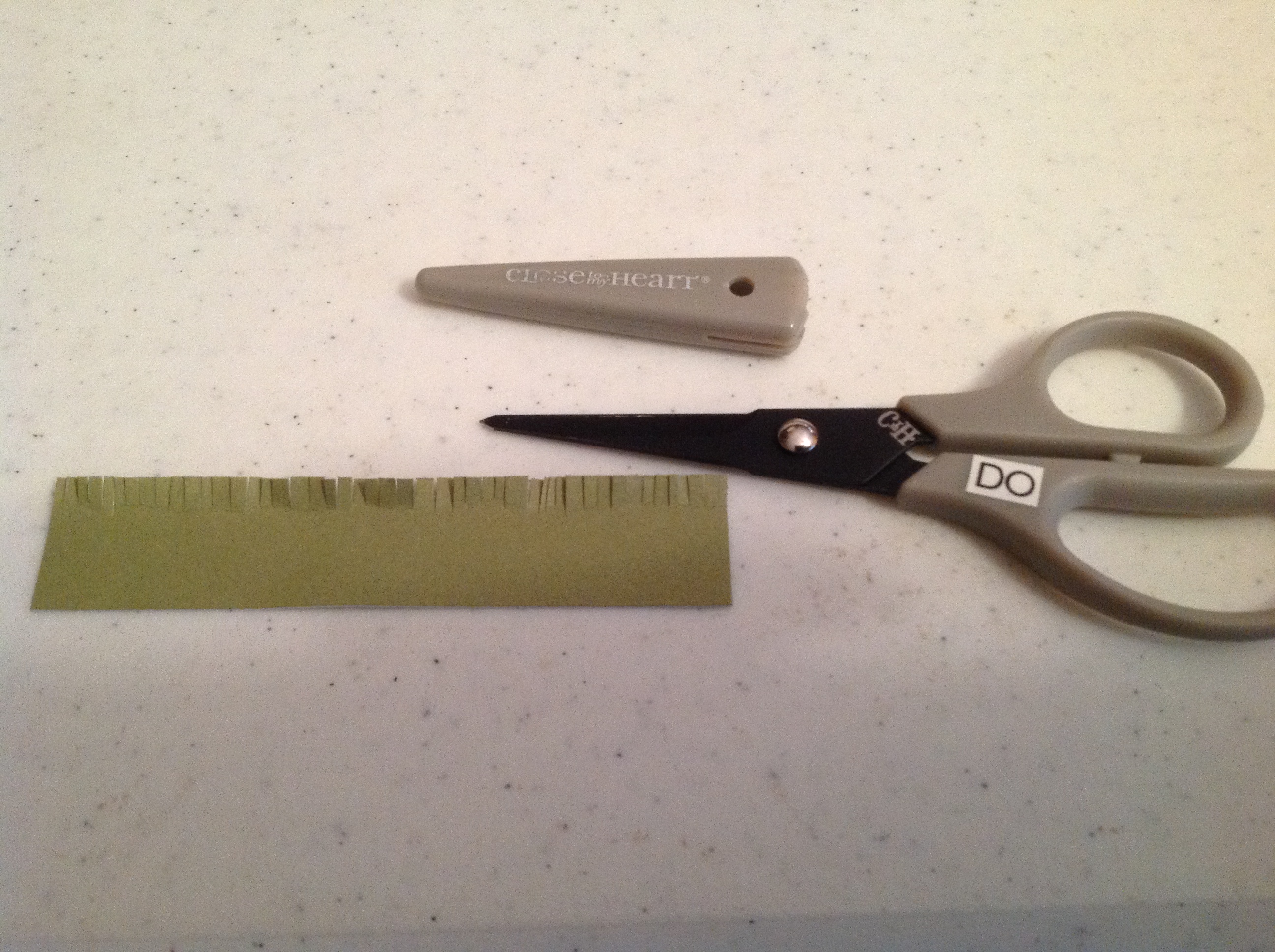 2. Next cut a piece of background pattern paper to 3.75″ X 5.50″. Cut a piece of green cardstock .75″ X 3.75″. Use precision tip scissors to cut across the top of green cardstock to create grass. I used CTMH Pathfinding Paper Pack for patterned paper and the cardstock.