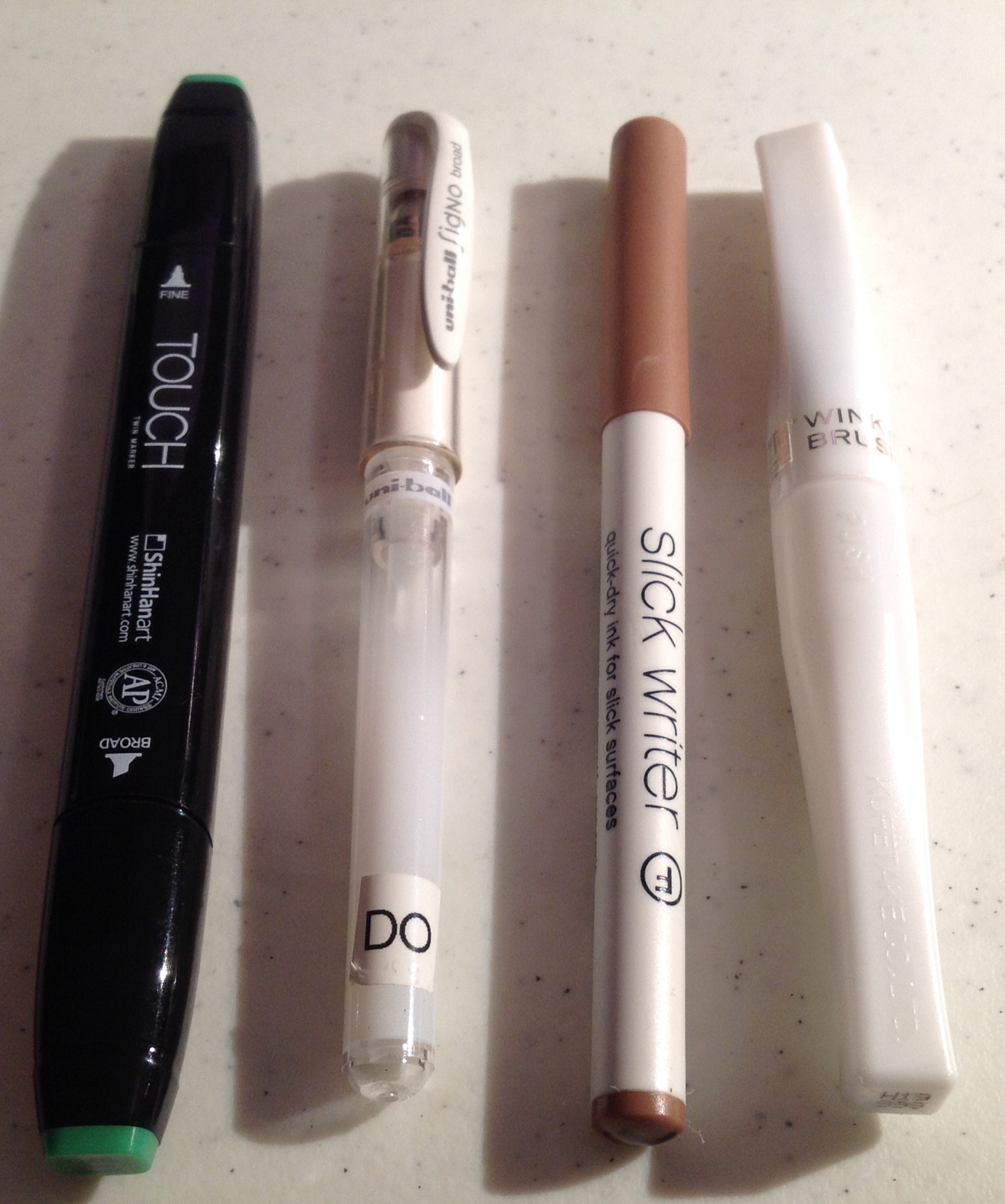 8. Pens I used to enhance the Shapes include: (left to right): CTMH Green Alcohol Ink Pen, White Signo Pen, Brown Slick Writer Pen and Wink of Stella Clear Pen.
