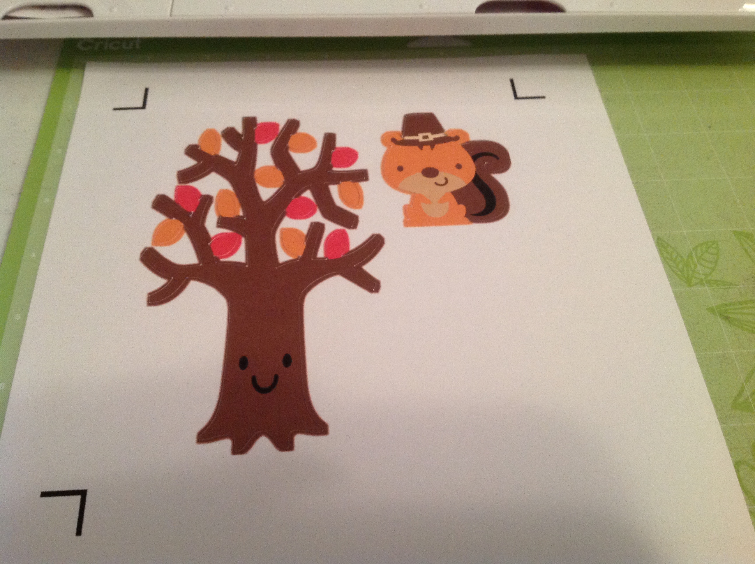 1. Use the Print Then Cut to ” Flatten” the Tree and Pilgrim Squirrel images from Create A Critter 2 cartridge. The tree is sized @ 5.25″ and the Squirrel is sized @ 2.25″. You can see how to use Print Then Cut with Cricut Explore on my post HERE.