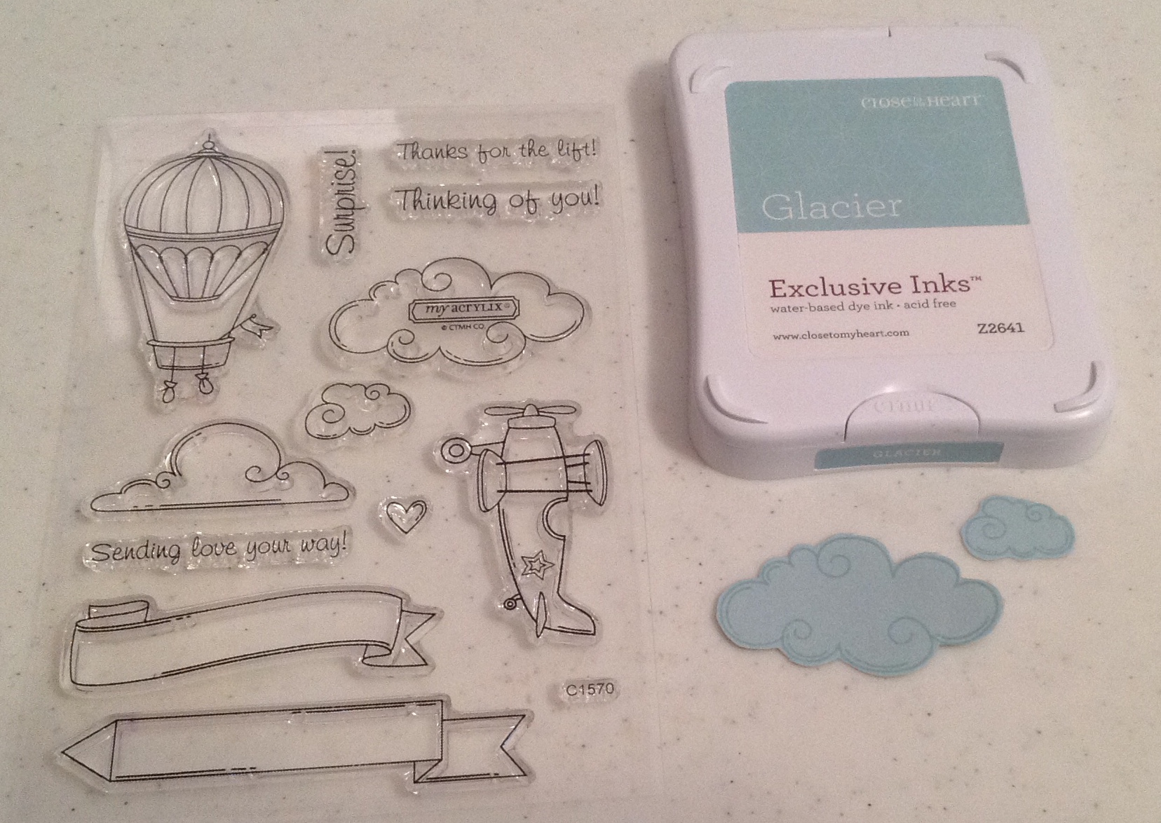 4. Next, stamp some clouds using blue ink on blue cardstock. Trim with precision tip scissors. I used CTMH Lifting Spirits stamp set C1570 and CTMH Glacier Ink on CTMH Glacier Cardstock.