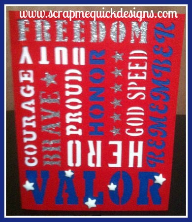And every letter of the Patriotic card cut out perfectly in cardstock. I then lined each of the words with different colors and materials to really make the words pop on the card. This card is image #M101176 and is one of many great cards on the exclusive Close To My Heart Artfully Sent Cartridge sold by CTMH Consultants only. You can purchase Close to My Heart Artfully Sent Cricut Cartridge in my CTMH shop @ debbieoneal.ctmh.com. Note: If you purchase the CTMH Artfully Sent Cartridge from me, I will email you a BONUS Cricut Explore Artfully Sent Cutting Guide.