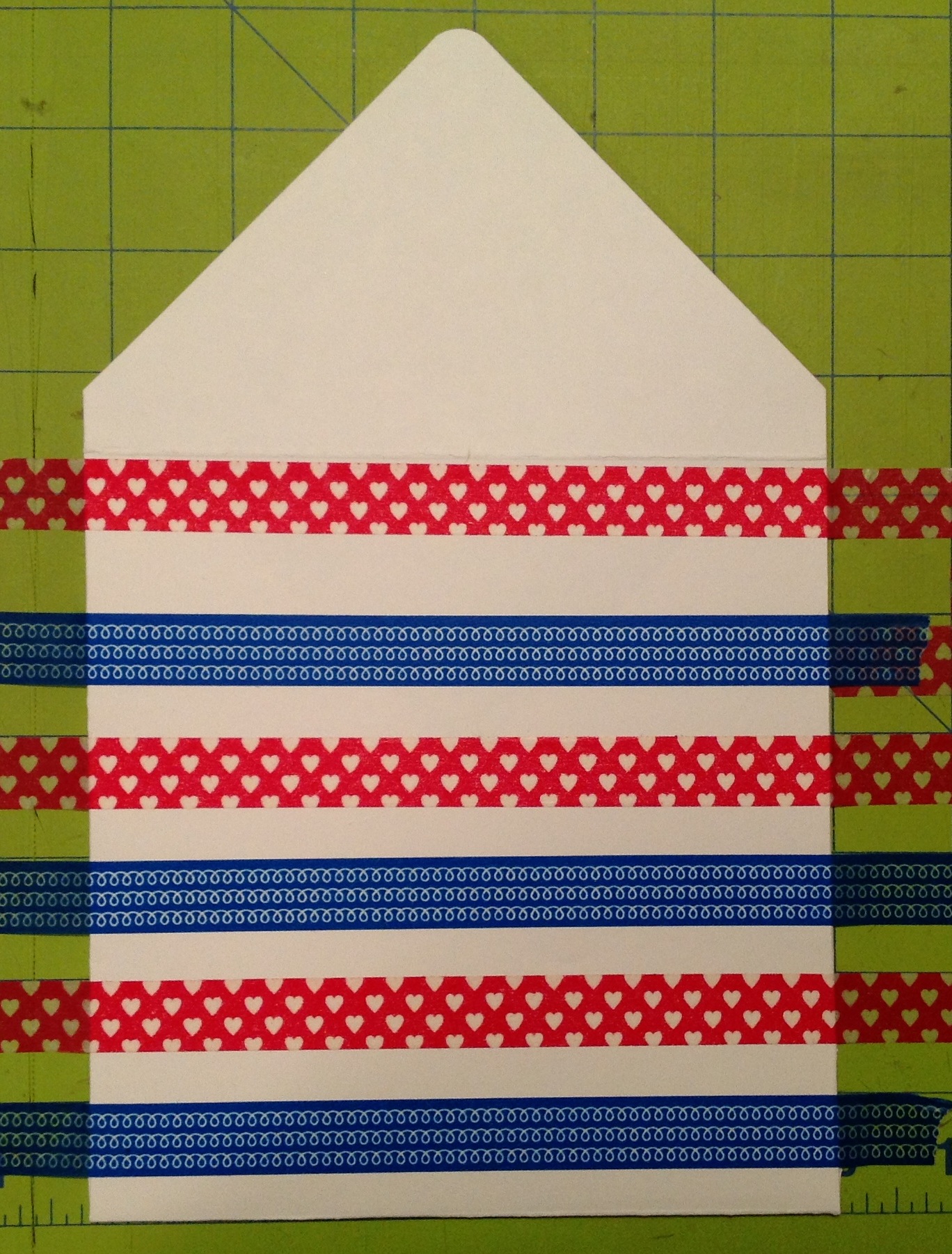 Using a grid mat and selecting a red and a blue washi tape from my washi stash, I laid out stripes on my envelop to create a red/white/blue pattern.