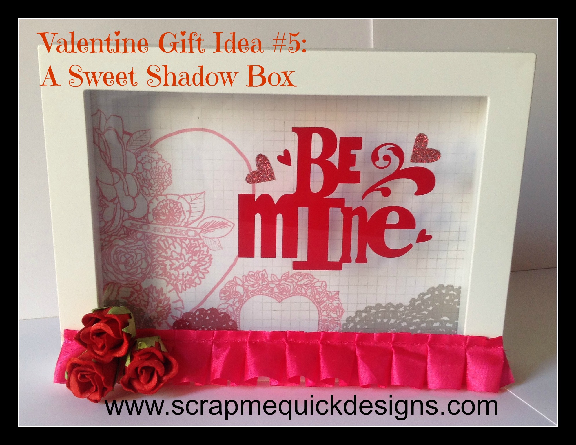 4. Now you need to embellish the front of your shadow box to give it that extra special touch. I used some gathered ribbon trim I had in my stash and attached it using double sided Scor-Pal Tape to hold it on to the bottom edge of the shadow box frame. I used hot glue to add these three rose flowers to complete the decoration.
